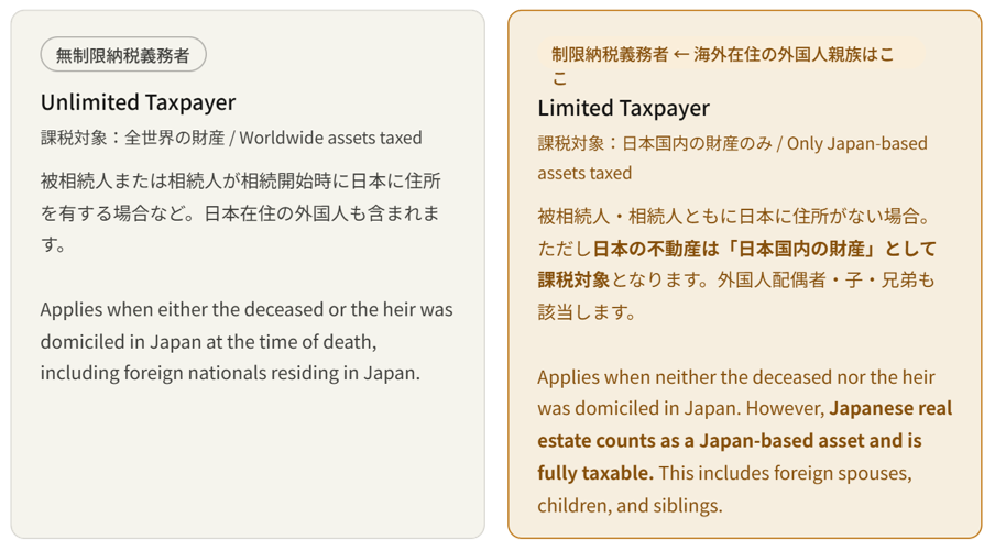 A common misconception is that “foreign nationals don’t have to pay Japanese inheritance tax.” In reality, Japan’s inheritance tax law classifies heirs as either “Unlimited taxpayers” or “Limited taxpayers.” Most foreign heirs fall into the “Limited taxpayer” category — and are still taxed on all assets located within Japan.